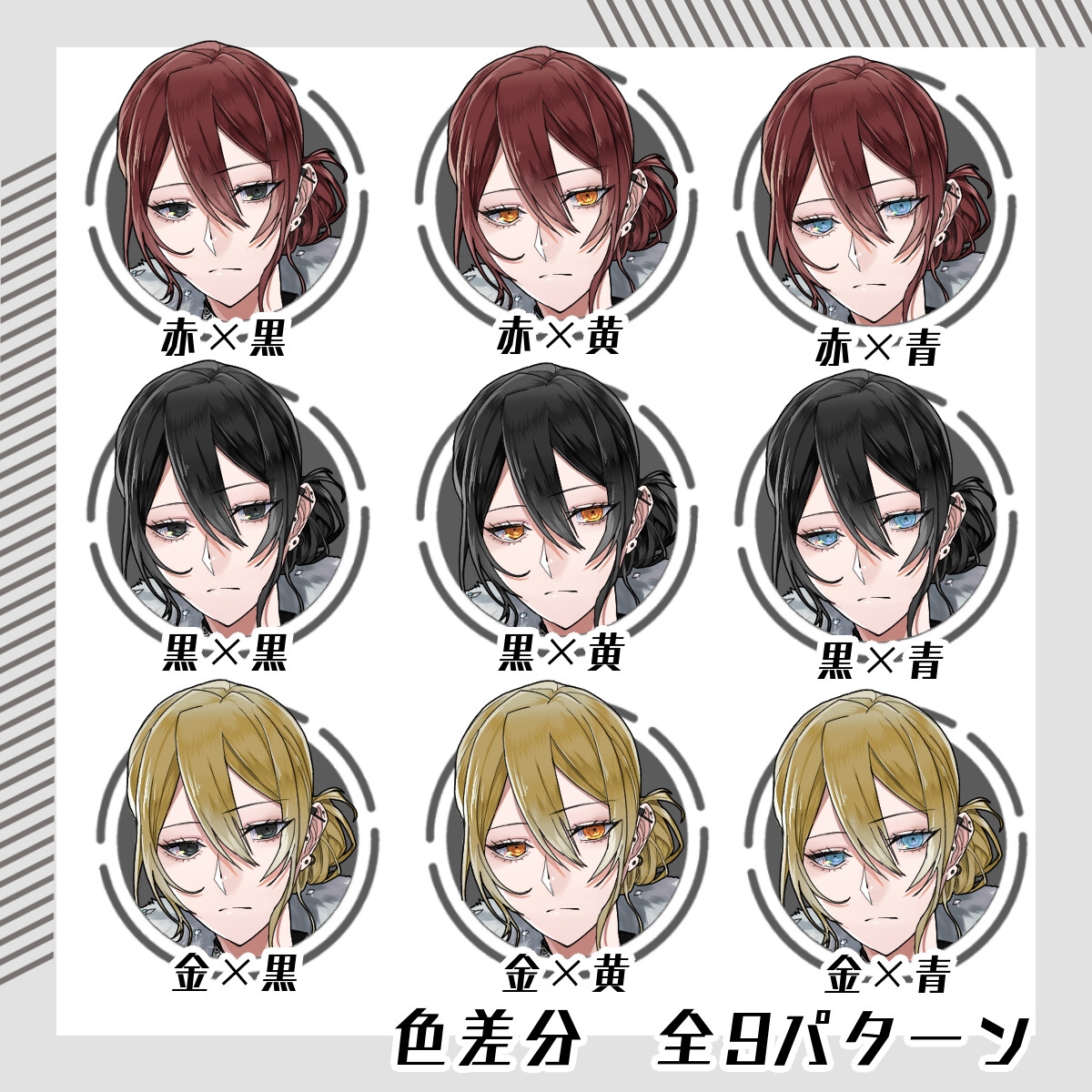 髪色、目の色の組み合わせ差分9種……続きは【立ち絵素材03】スーツ女性(全身・髪色差分あり)[素材屋まるお] RJ01429554へ