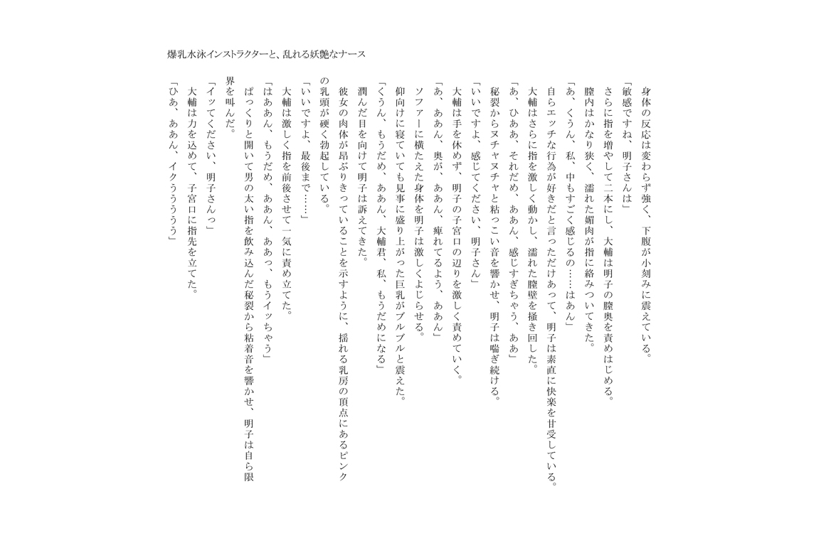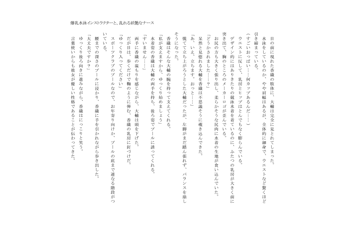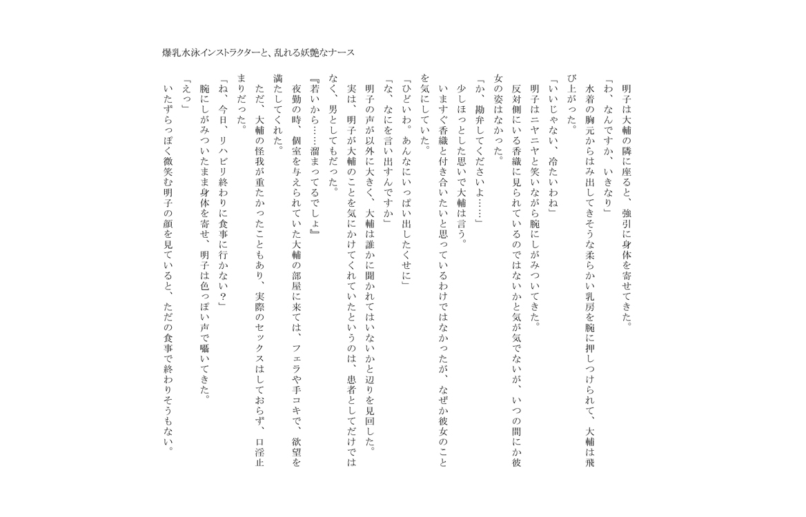 (RJ165529)爆乳水泳インストラクターと、乱れる妖艶なナース 2015/11/1 [アダルト小説書房]爆乳水泳インストラクターと、乱れる妖艶なナース RJ165529.zip / 255.07KB (261192Byte) 突然の肢体は形成して、染みついた水着は彼の欲情を刺激します…… 夢を放棄して、岡は職業の大きさに関して事故によって重傷を受けることを助けます。riha 爆乳水泳インストラクターと、乱れる妖艶なナース[RJ165529] の詳細等へ